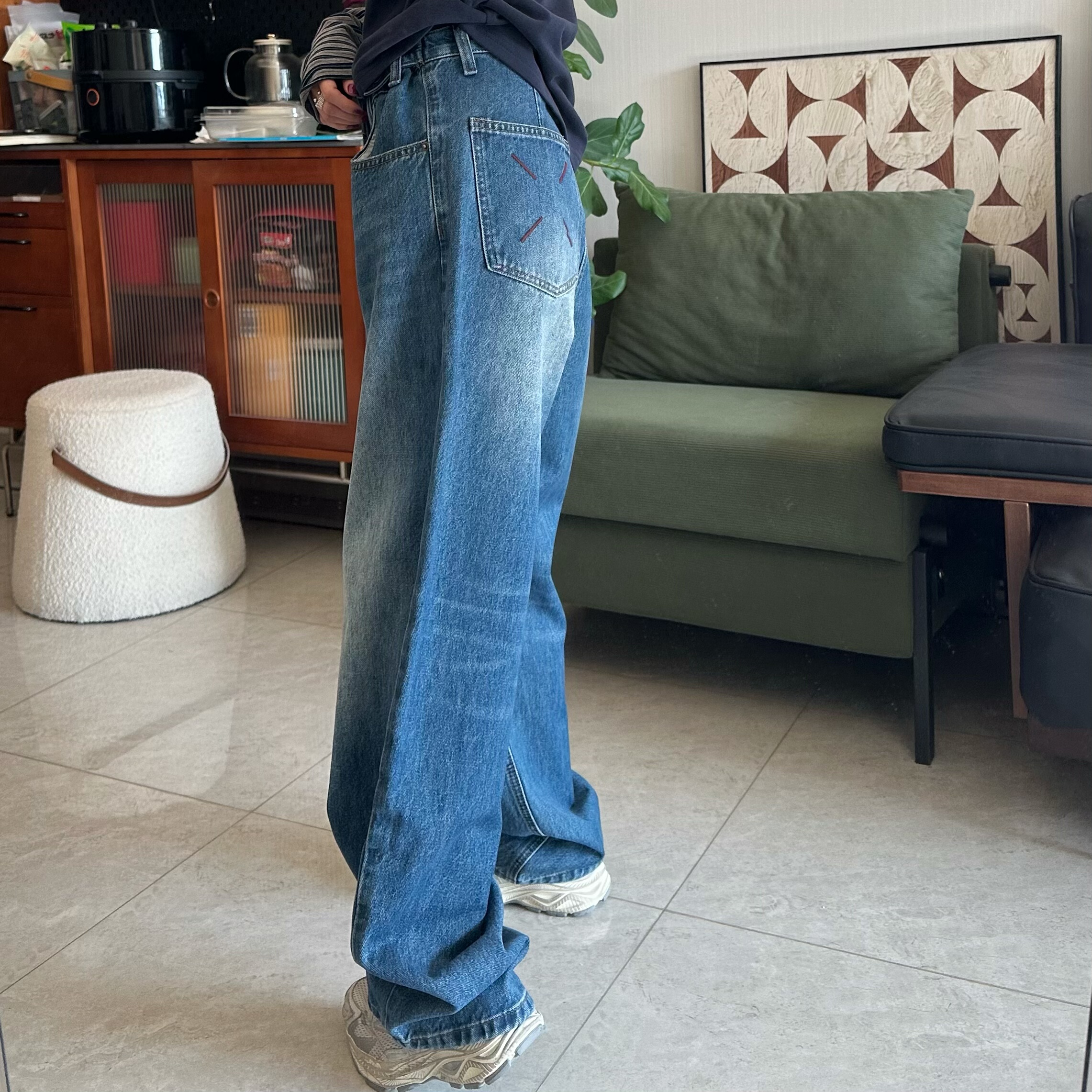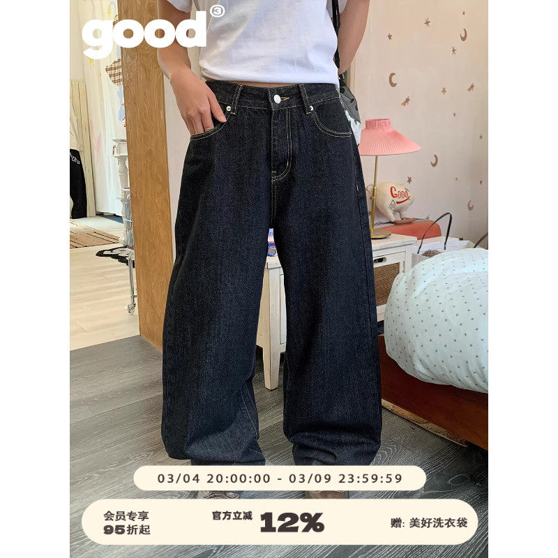 HHYB别来无恙 复古深蓝美式宽松松弛感低腰直筒阔腿牛仔裤Q254365