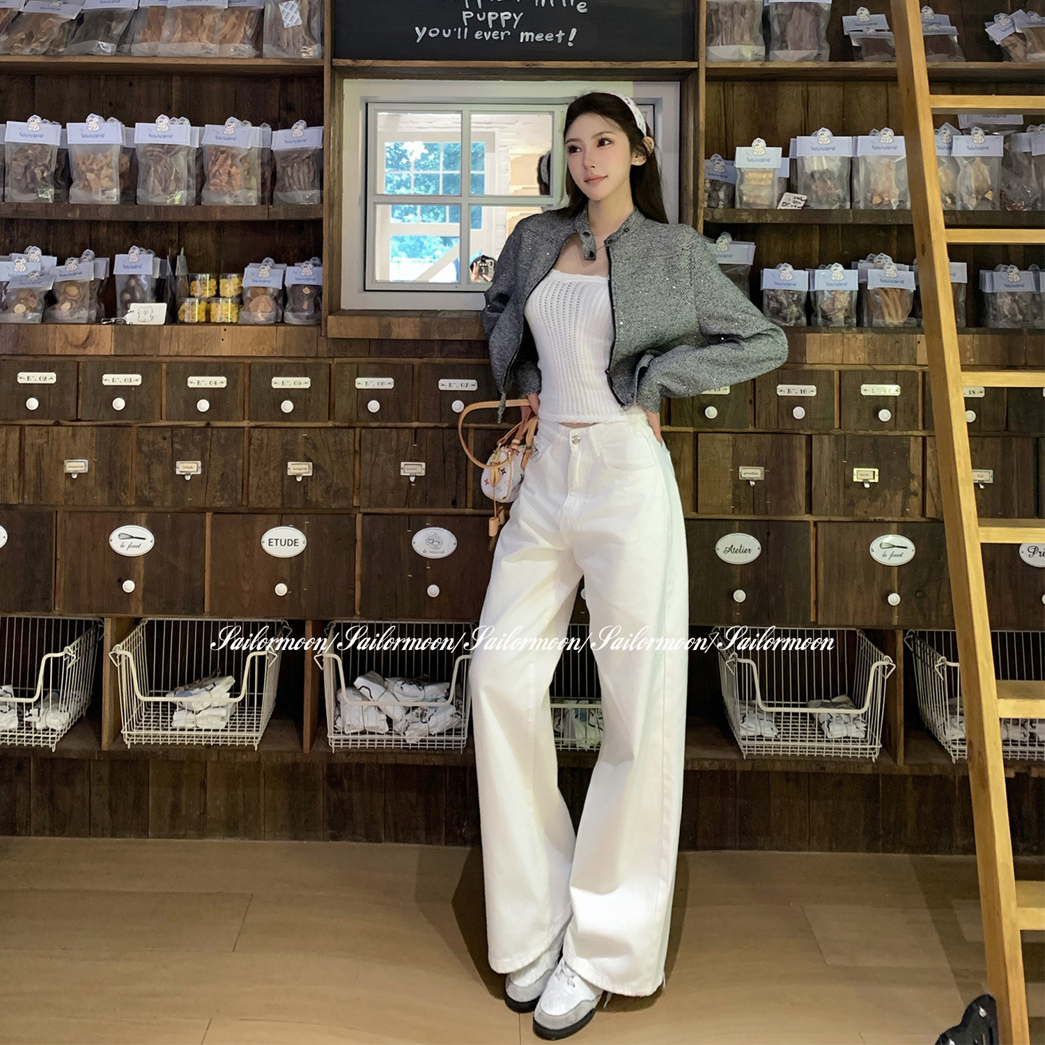 Halo Luu白色直筒牛仔裤女春季2026新款休闲裤窄版显瘦拖地阔腿裤