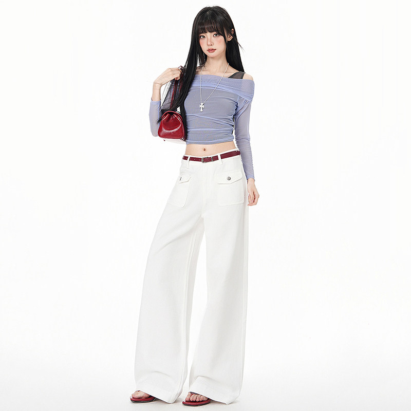 花漾2026春季新款翻盖口袋设计白色宽松休闲裤直筒阔腿牛仔裤长裤