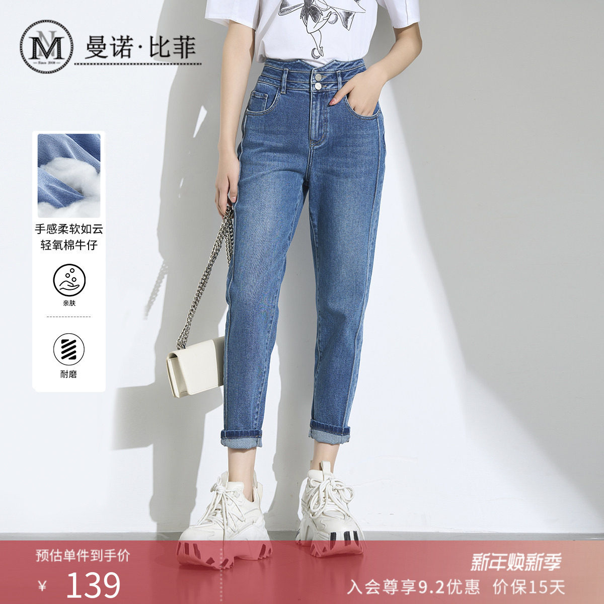 秋冬新款水洗牛仔哈伦裤女高腰百搭休闲裤显瘦束脚萝卜裤奶奶裤潮