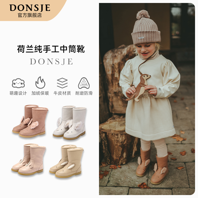 Donsje荷兰冬季羊毛加绒中筒靴女童防滑兔子款短靴宝宝保暖真皮靴