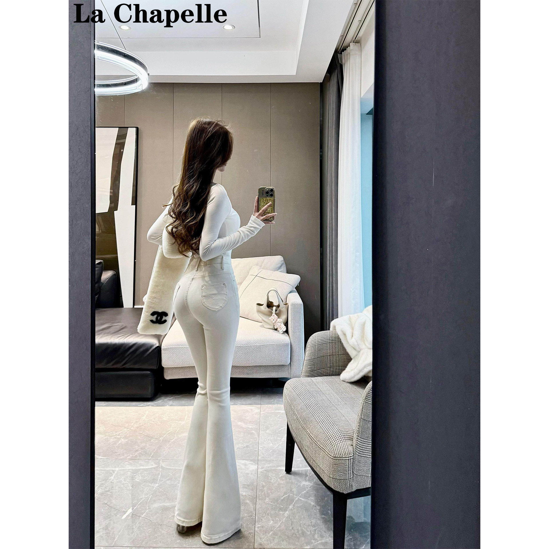 拉夏贝尔白色加绒微喇牛仔裤女春秋2026新款修身显瘦喇叭马蹄裤子