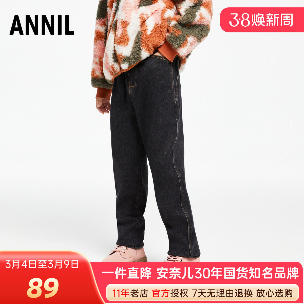 安奈儿女童装加绒黑牛仔夹裤2024冬新款加厚保暖宽松修身休闲裤子