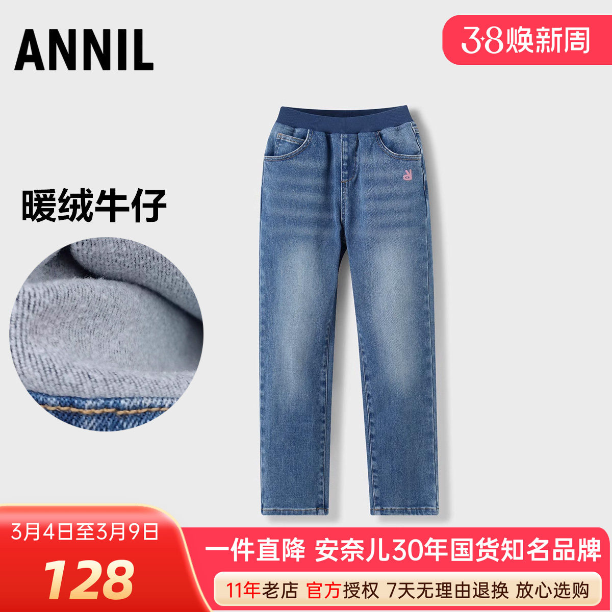 安奈儿女童加绒牛仔长裤2025冬季新款休闲厚保暖弹力修身轻暖