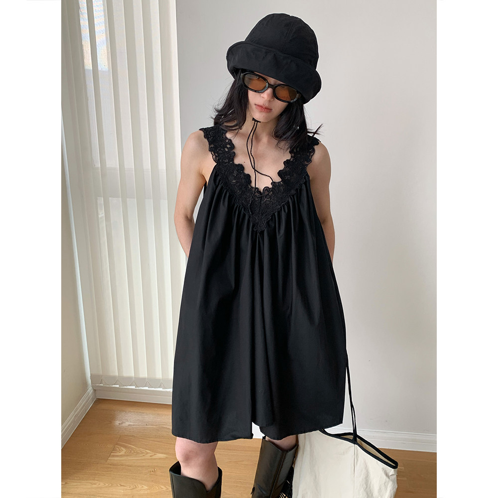 AMBOSC 夏季新品法式蕾丝边V领吊带连衣裙女纯色无袖A字裙打底裙