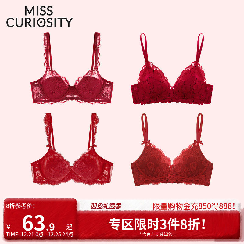 秋冬大红色蕾丝内衣女小胸聚拢上托薄款蕾丝收副乳无钢圈中厚文胸