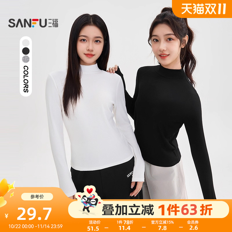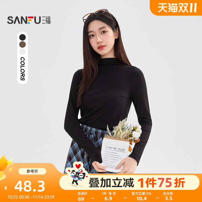 三福打底衫2025新款秋冬保暖立领内搭上衣显瘦黑色t恤女装511429