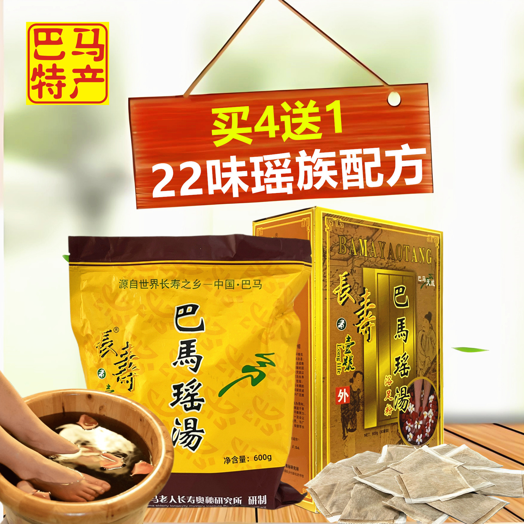 (买4送1)巴马瑶汤22味瑶族配方长寿者壹号600g泡脚浴沐足洗脚粉包