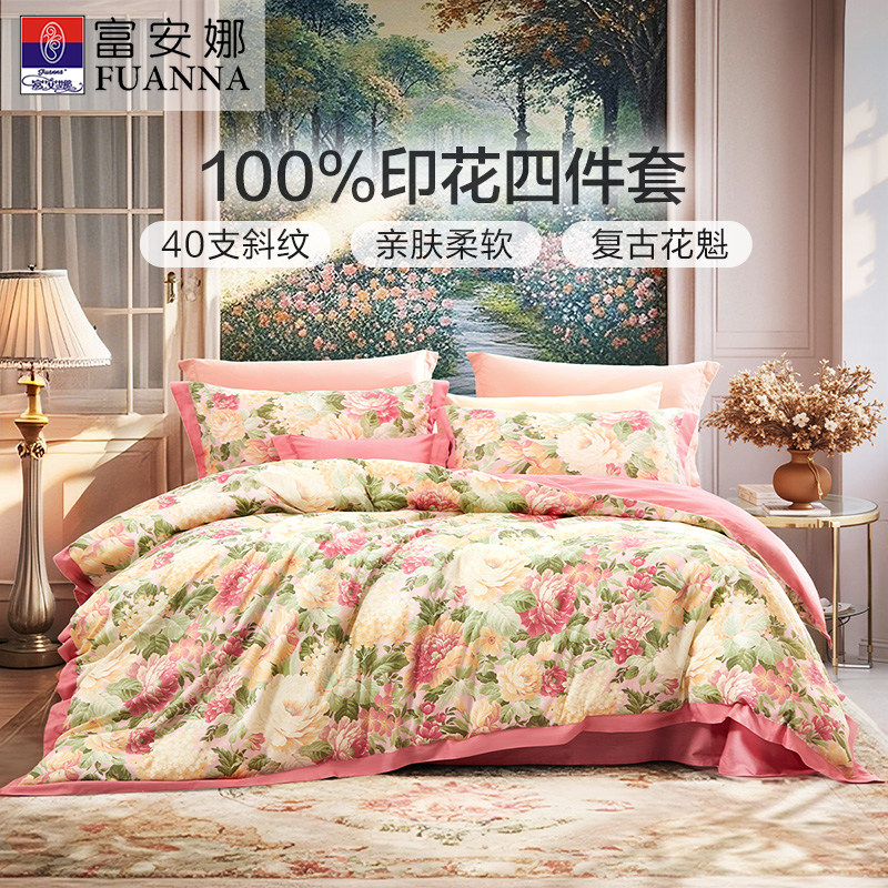 富安娜四件套全棉纯棉婚庆床单被套被罩网红款结婚床上用品复古风