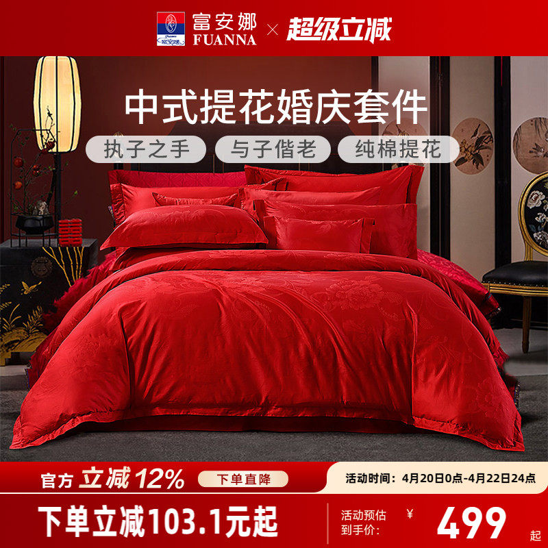 富安娜婚庆套件红色纯棉结婚床上用品轻奢提花喜庆婚嫁婚床单被套