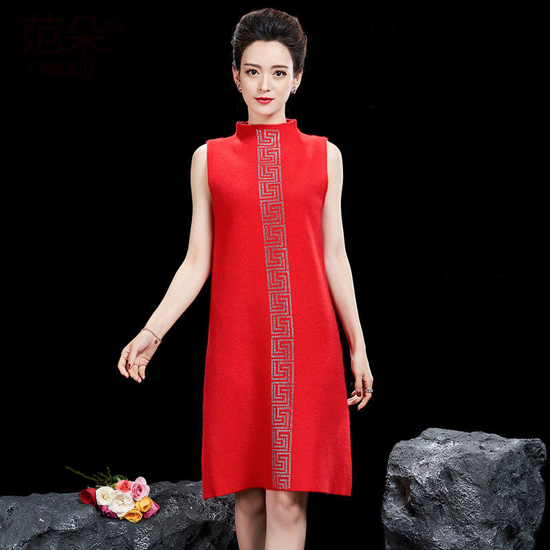 - 大红针织连衣裙