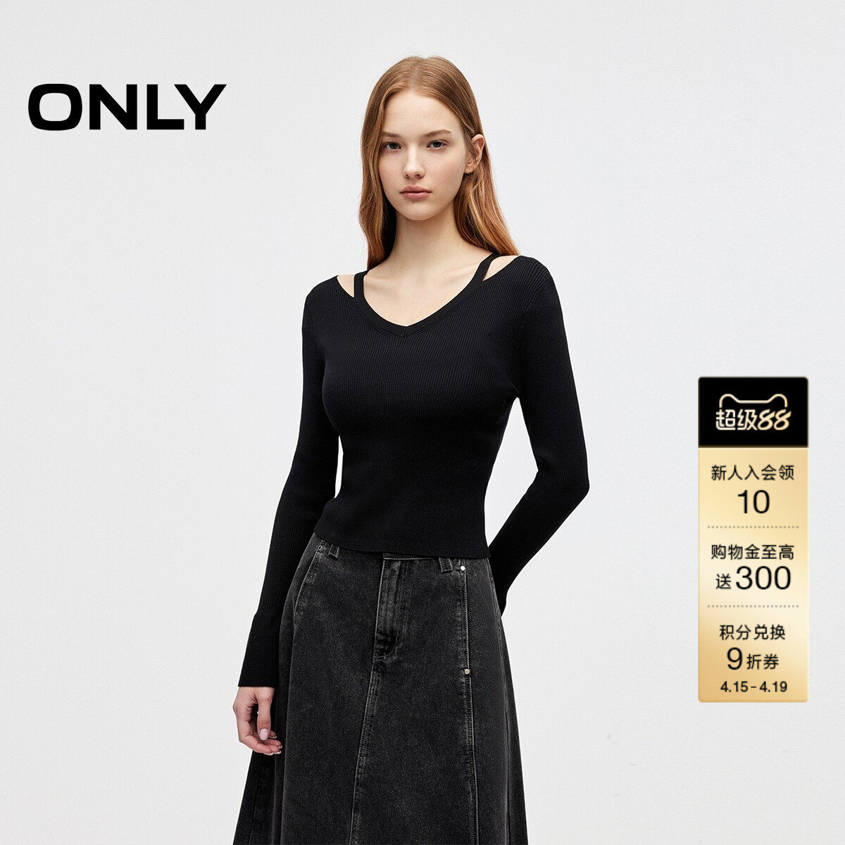ONLY春季甜美柔软V领露肩喇叭袖长袖微落肩纯色针织衫上衣女