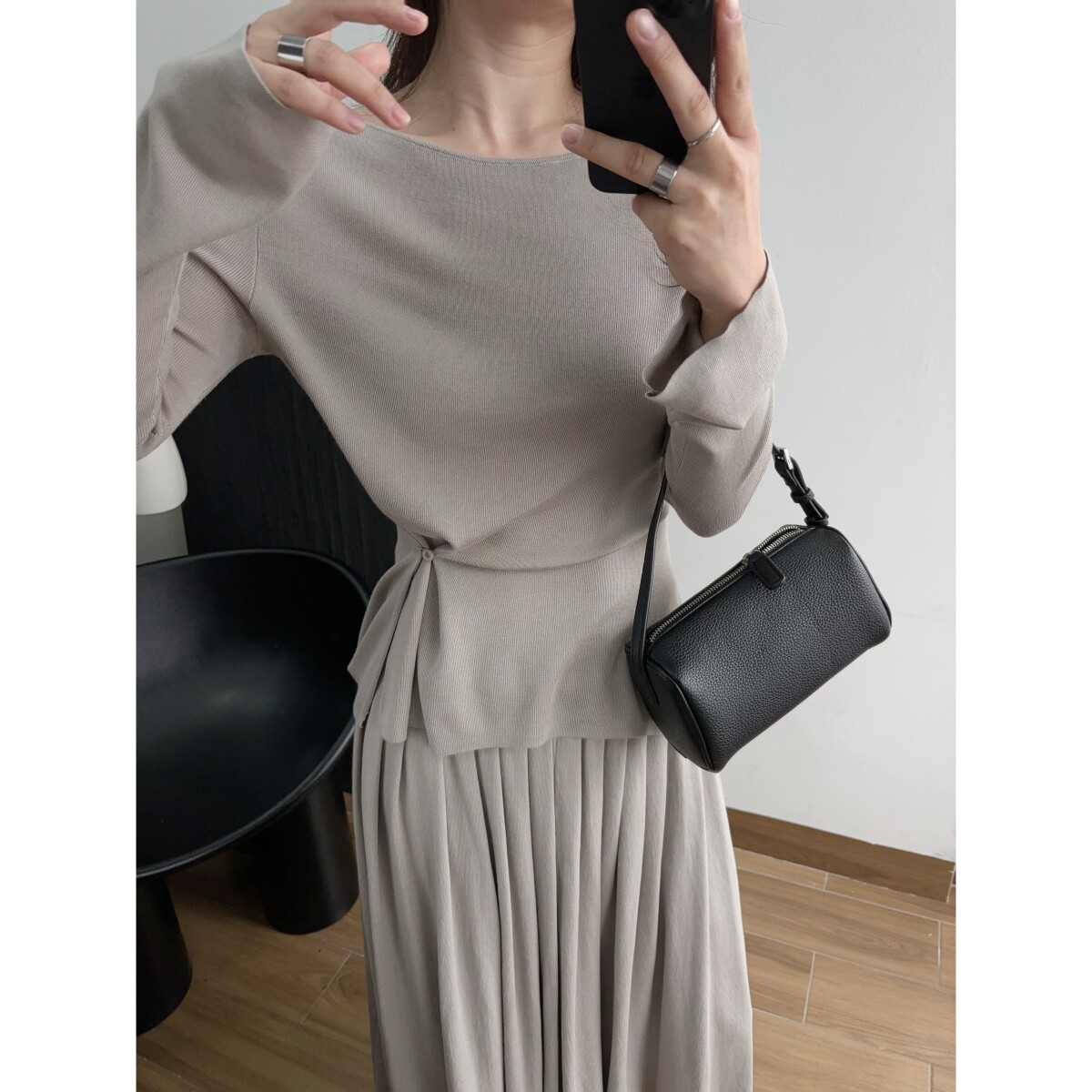 一字领收腰褶皱长袖2025新款简约气质系带针织上衣喇叭袖女套装