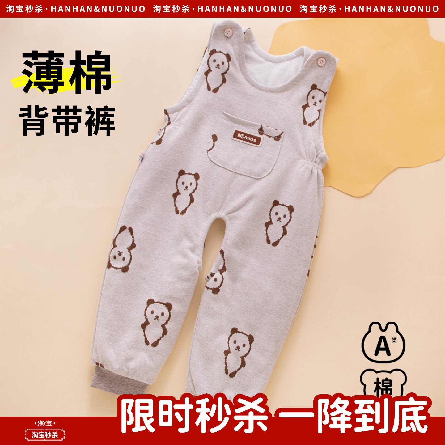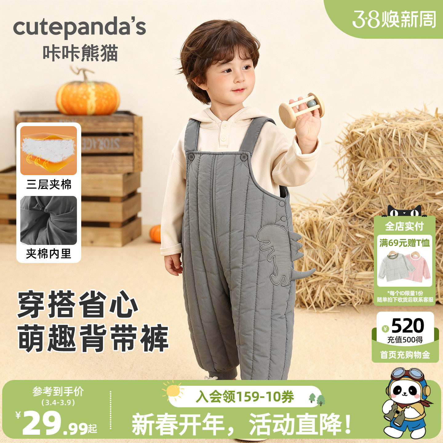 咔咔熊猫男童女童绗棉背带裤冬装秋冬儿童宝宝小童休闲毛绒长裤潮