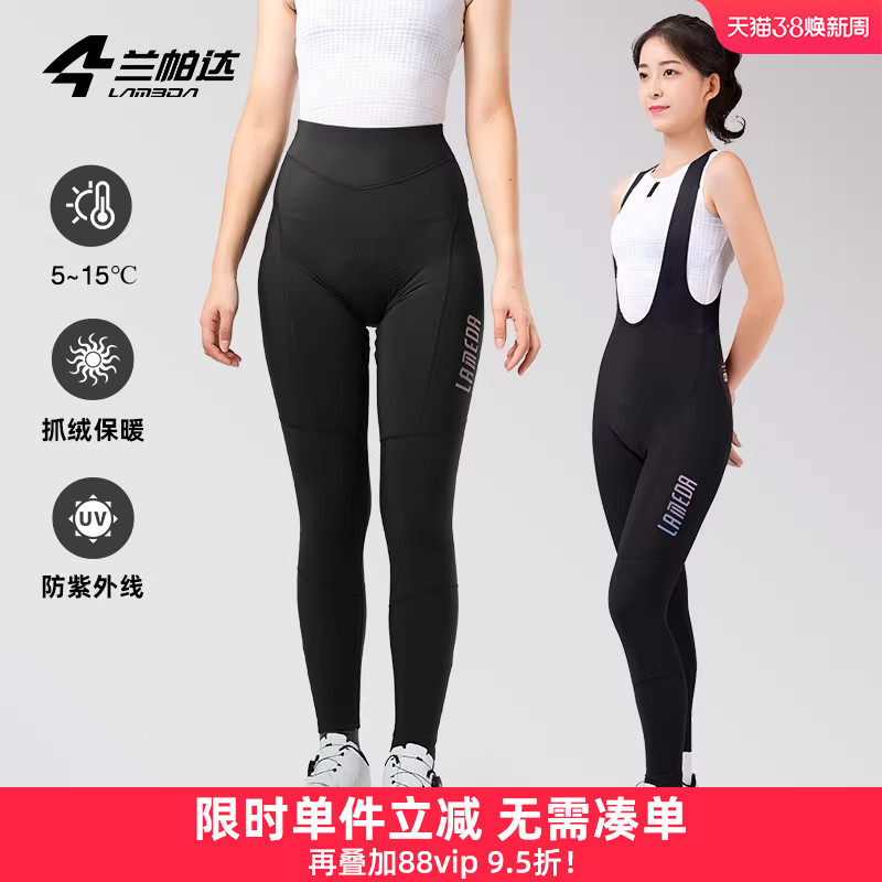 兰帕达女5-15度秋冬抓绒骑行背带长裤保暖防紫外线加绒自行车霞绯