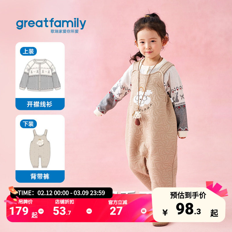 歌瑞家女童背带裤2025冬休闲时尚百搭长裤卡通印花针织保暖休闲裤