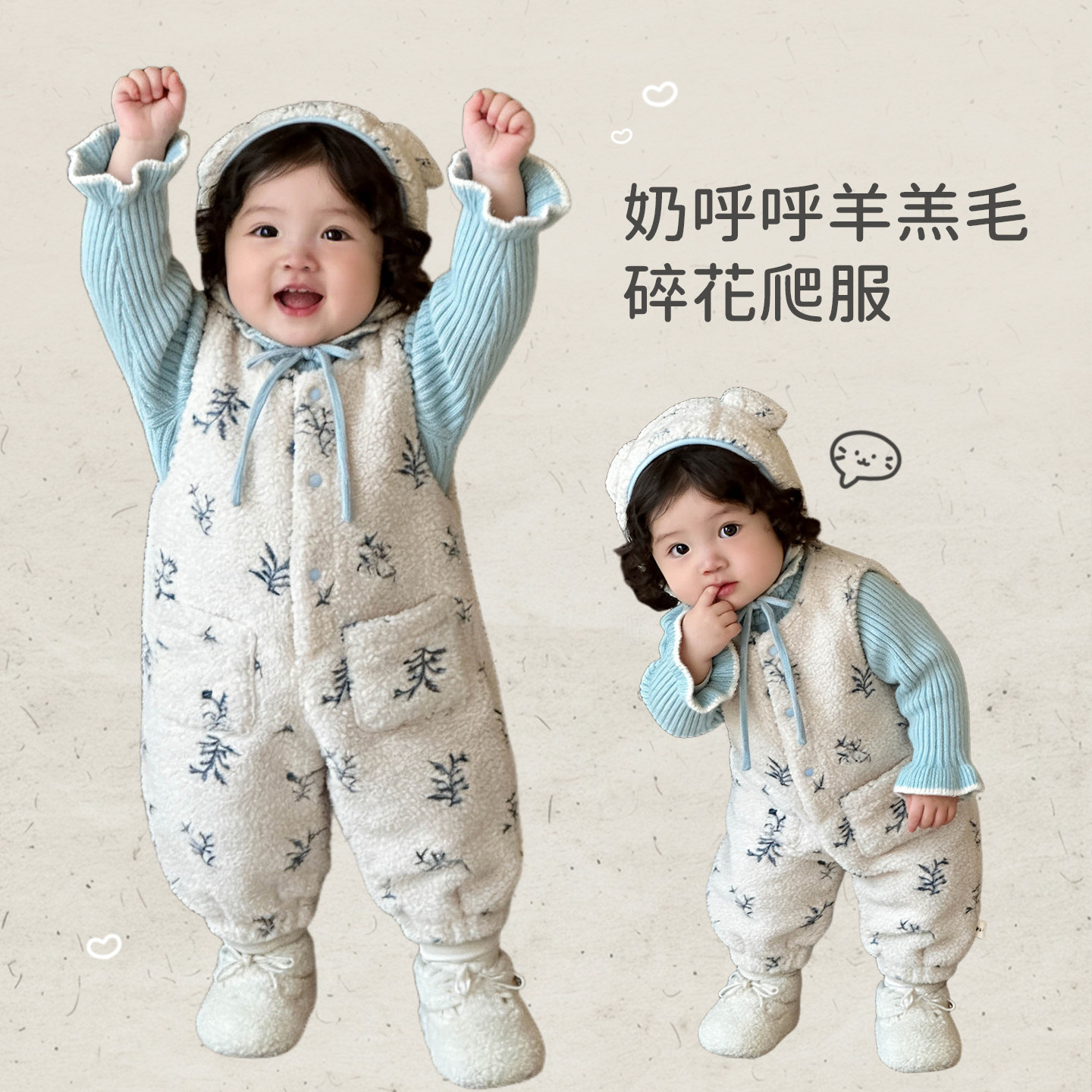 女童冬款加绒背带裤套装女宝宝可爱羊羔毛连体衣婴儿加厚保暖毛衣