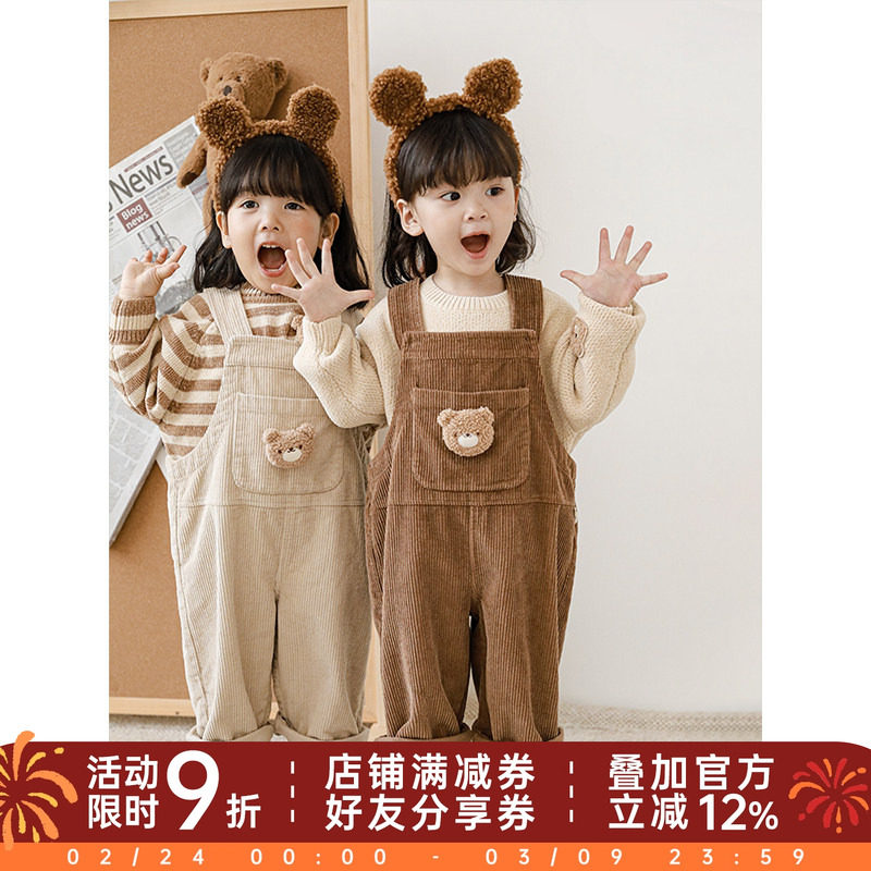 幼悠女童时尚背带裤立体小熊玩偶儿童秋冬复古坑条宽松调节裤子潮