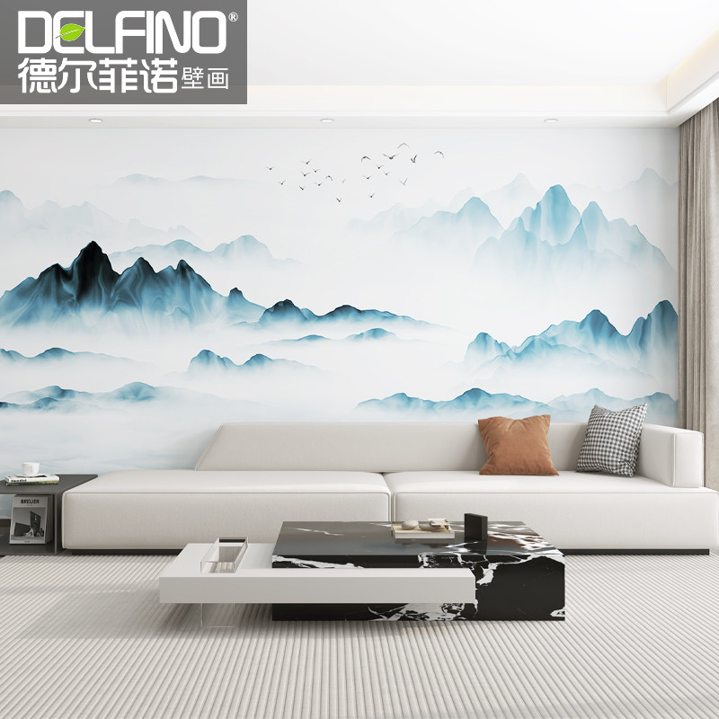 新中式山水无缝墙布卧室r客厅沙发电视背景墙壁布现代简约定制壁