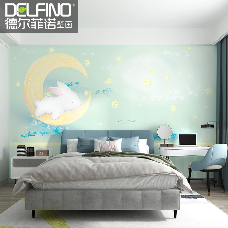 环保无缝墙布卧室床头儿童房墙纸月亮白兔子卡通粉色女孩壁画壁布