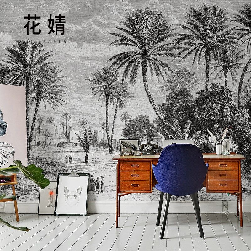 法式热带风景电视背景墙定制壁画轻奢无缝墙布卧室客厅无纺布壁纸