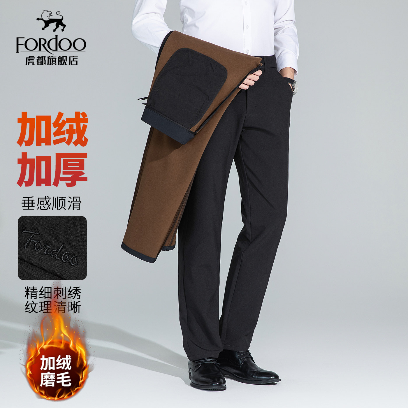 才子男装加绒加厚商务休闲裤男2025秋冬新款保暖修身直筒黑色裤子