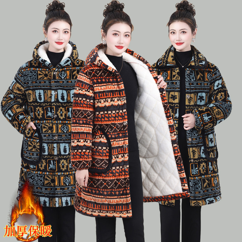 秋冬中长款连帽棉衣加绒保暖民族风印花棉服外套洋气中老年妈妈装