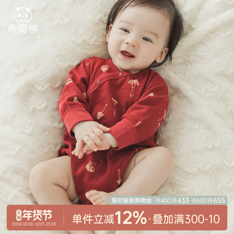乖奇熊婴幼儿纯棉连体衣服春秋季宝宝三角哈衣红色喜庆年服包屁衣