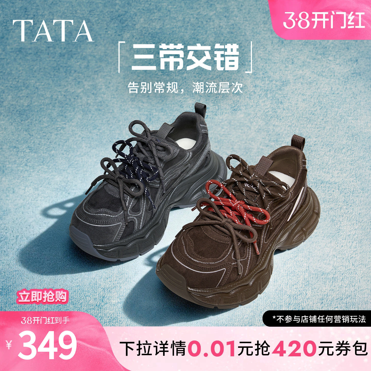 TATA他她漫游者女鞋透气休闲鞋2026新款运动鞋百搭增高厚底老爹鞋