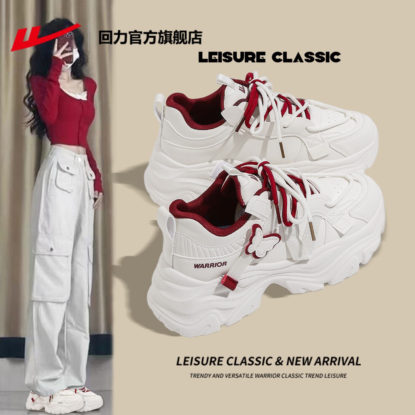 回力女鞋厚底老爹鞋女款2026新款韩版百搭红色鞋子蝴蝶运动休闲鞋