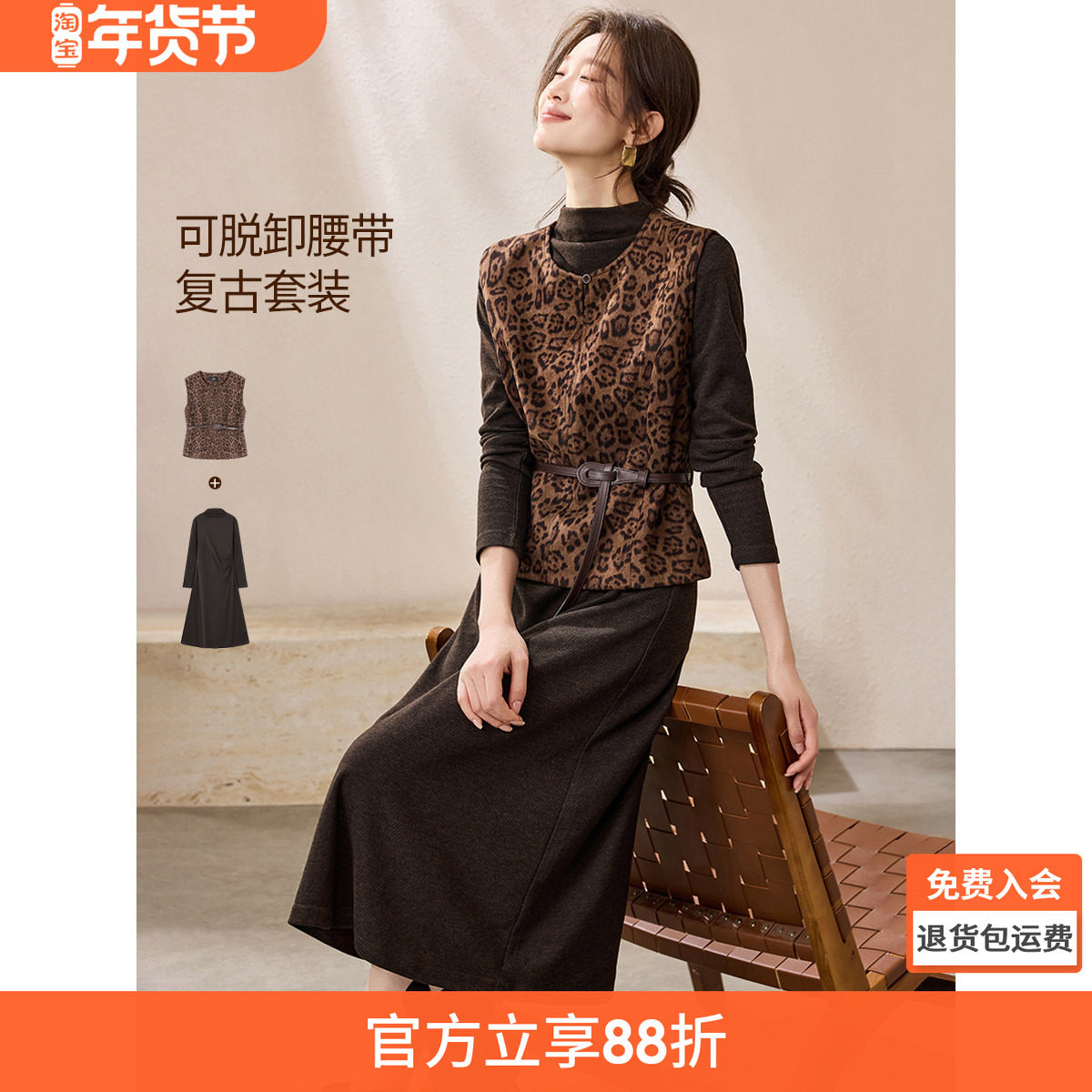 沫晗依美个性豹纹轻奢感两件套2025冬季新款马甲连衣裙两件套套装