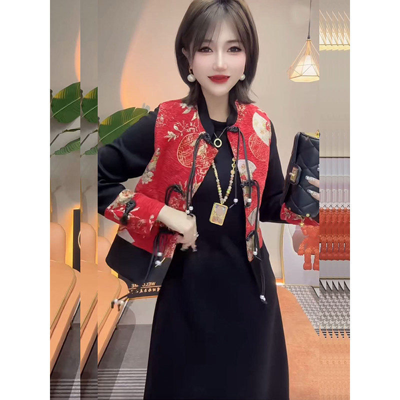 2025新中式复古国风年轻款秋冬加绒加厚过年旗袍马甲两件套连衣裙