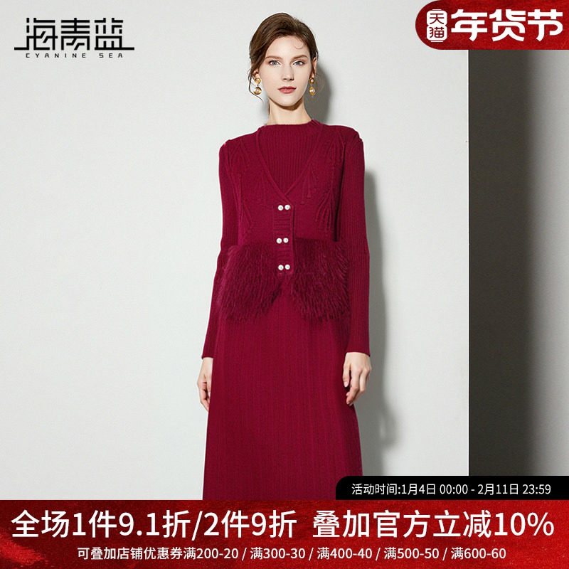 海青蓝新年红色套装针织马甲两件套连衣裙女2025秋冬款打底毛衣裙