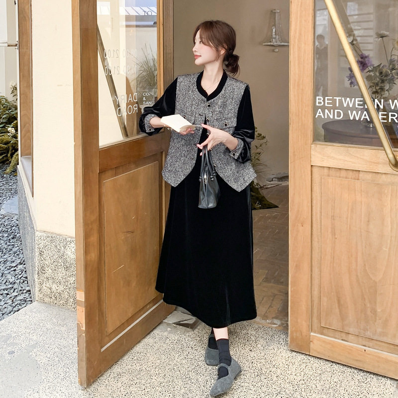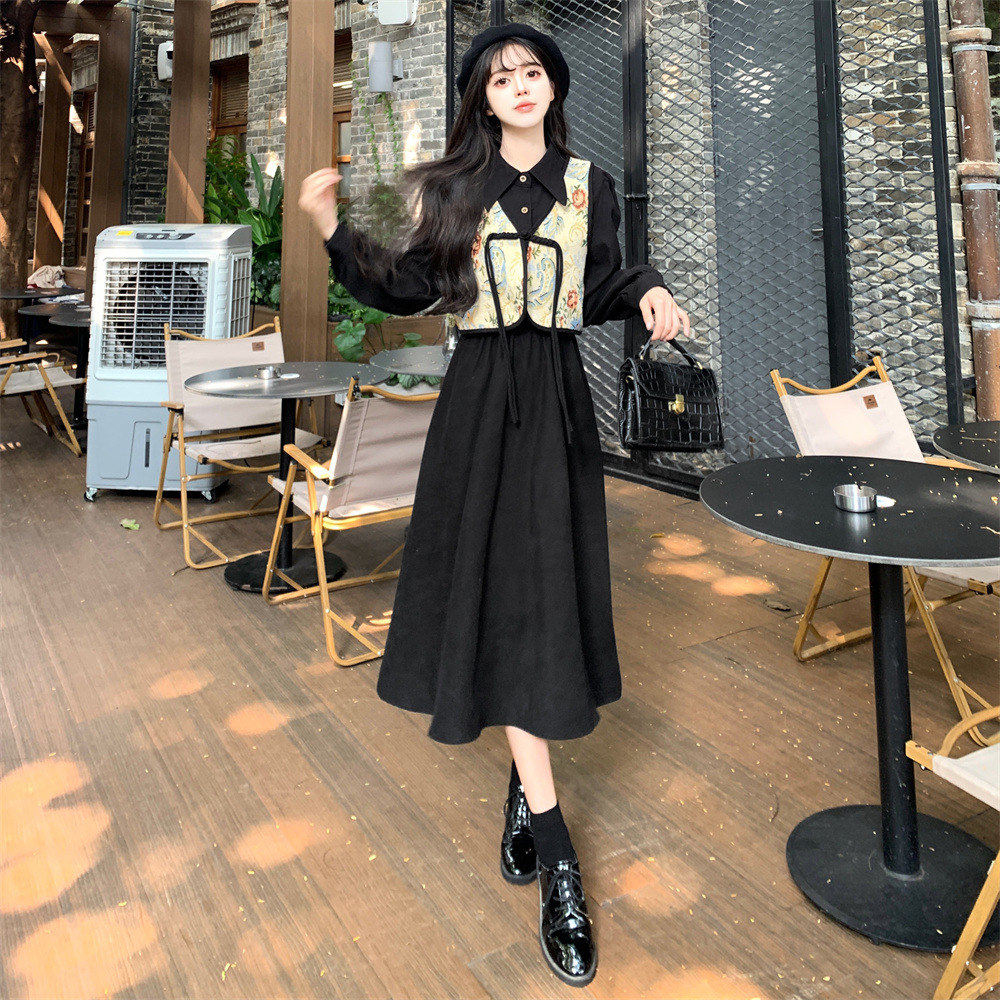 今年流行特惠实拍轻熟风复古小香风马甲两件套连衣裙2025秋款黑色