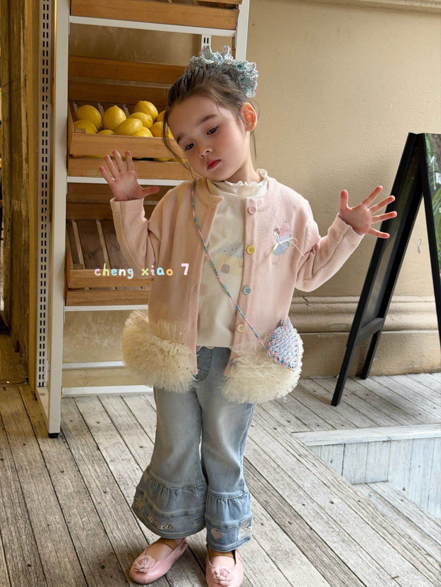 凡妈童装2026春款女童小童韩版亮片网纱针织开衫外套喇叭牛仔裤