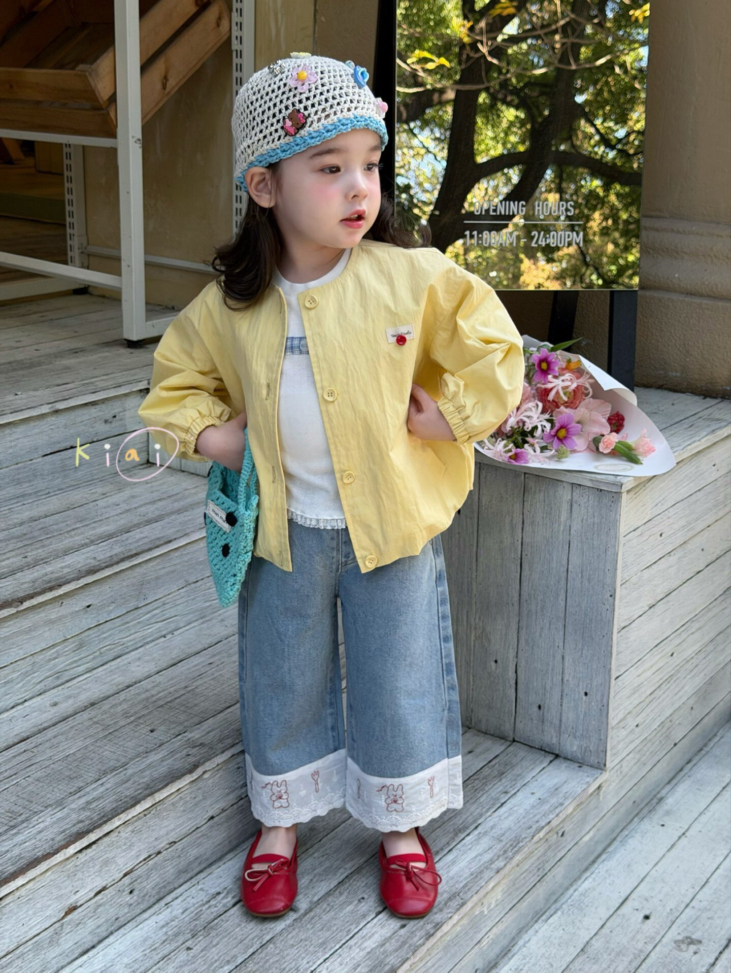 凡妈童装2026春款女童小童韩系贴布装饰洋气外套花边牛仔直筒长裤
