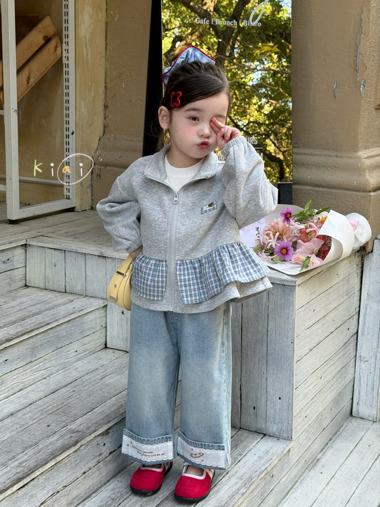 凡妈童装2026春款女童小童韩版格子荷叶边外套绣花边牛仔直筒长裤