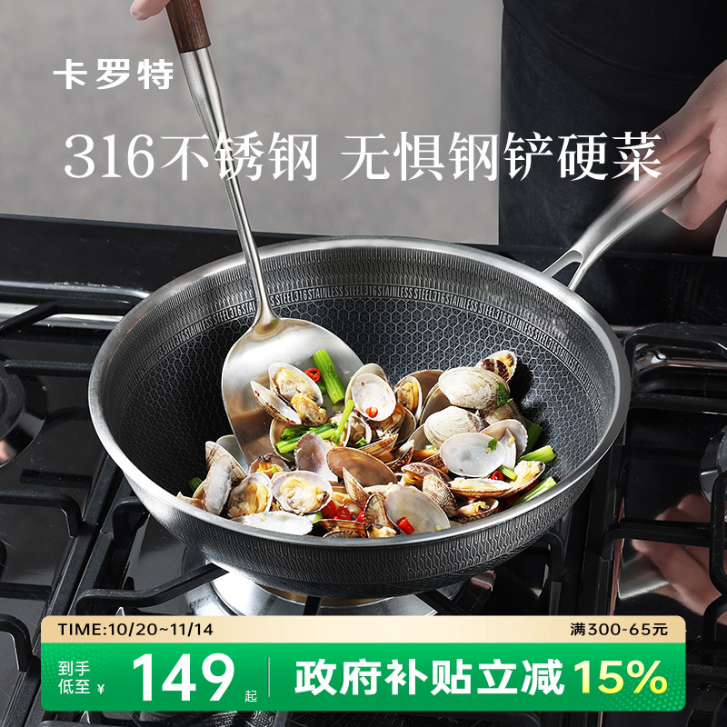 卡罗特炒锅家用316不锈钢蜂窝不粘锅炒菜平底锅电磁炉燃气灶专用