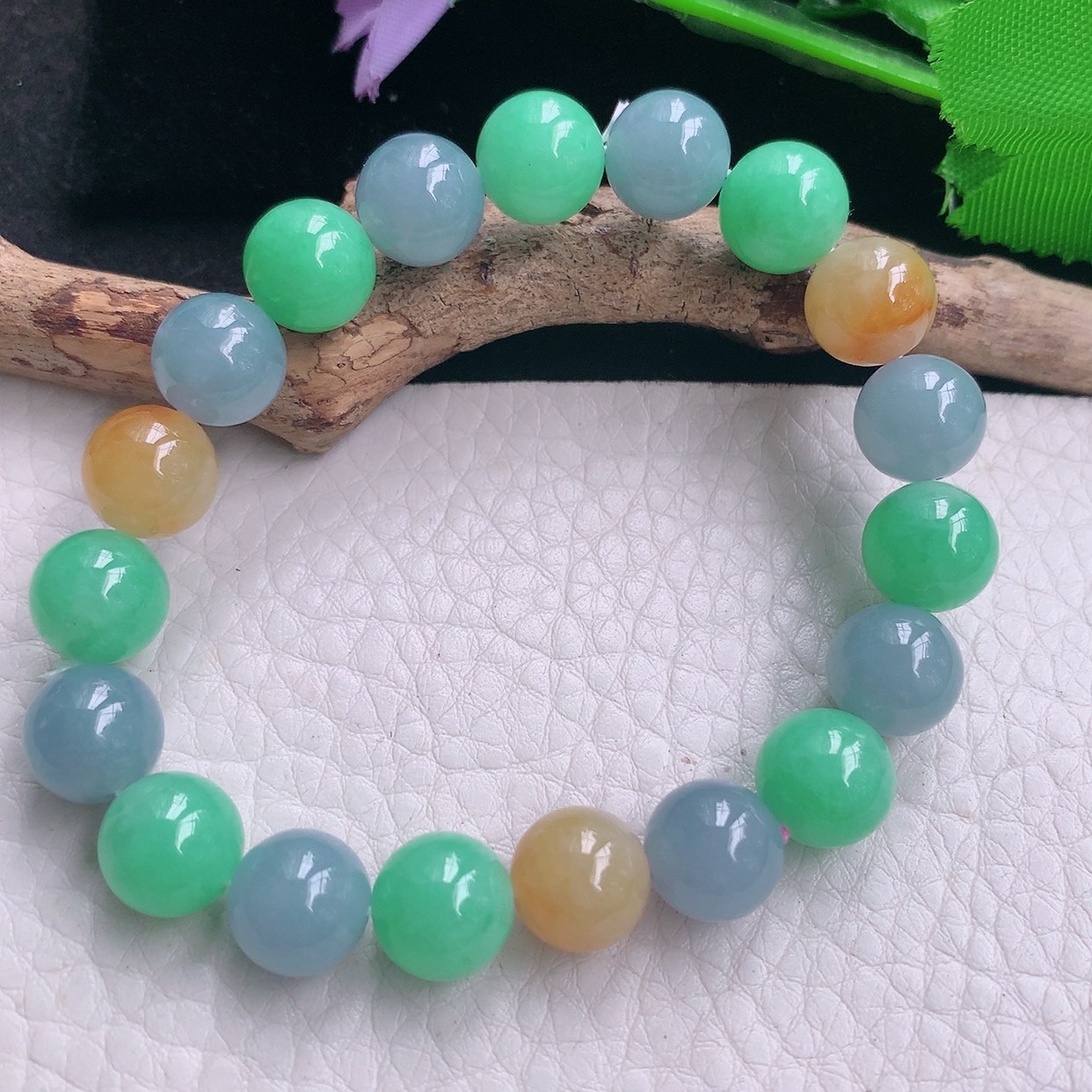 lz实拍10mm天然翡翠a货三彩圆珠手链多宝紫黄绿珠手串 女生珠串