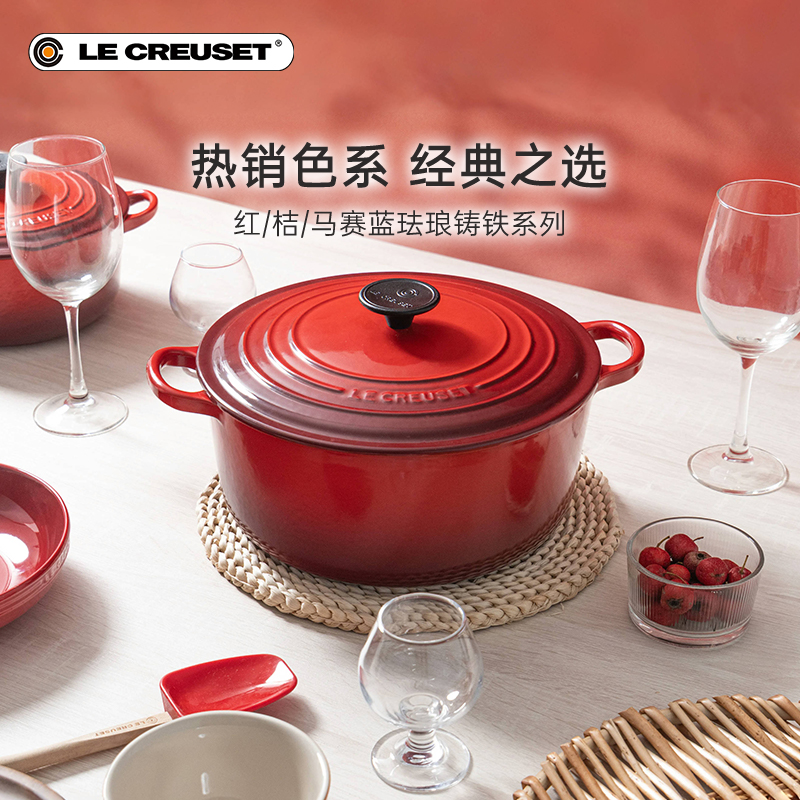 百年酷彩LE CREUSET红桔色珐琅铸铁锅海鲜锅深烧锅焖煮锅圆形锅