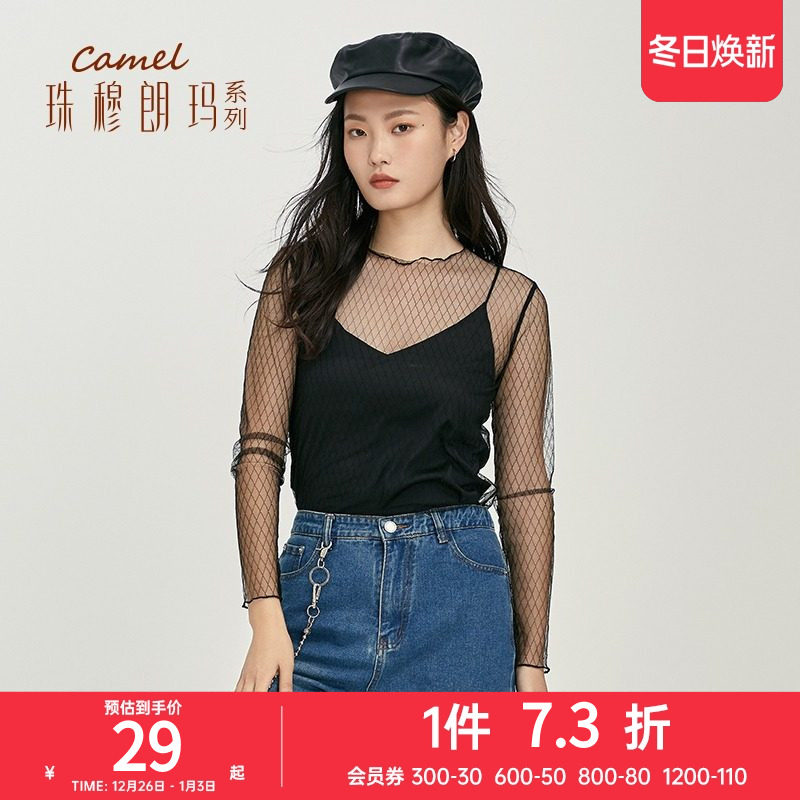 骆驼打底雪纺衫女长袖气质洋气百搭时尚超仙透明网纱内搭黑色纱衣