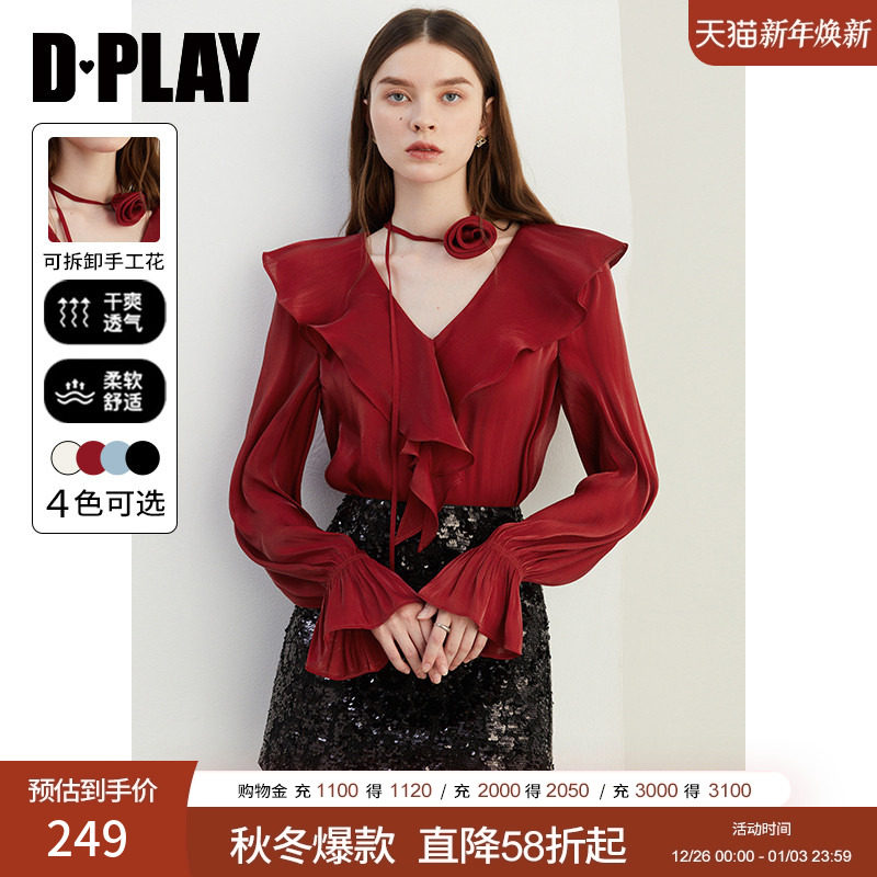 DPLAY2025年秋季新款红色衬衫女时尚气质法式雪纺衫上衣长袖衬衣