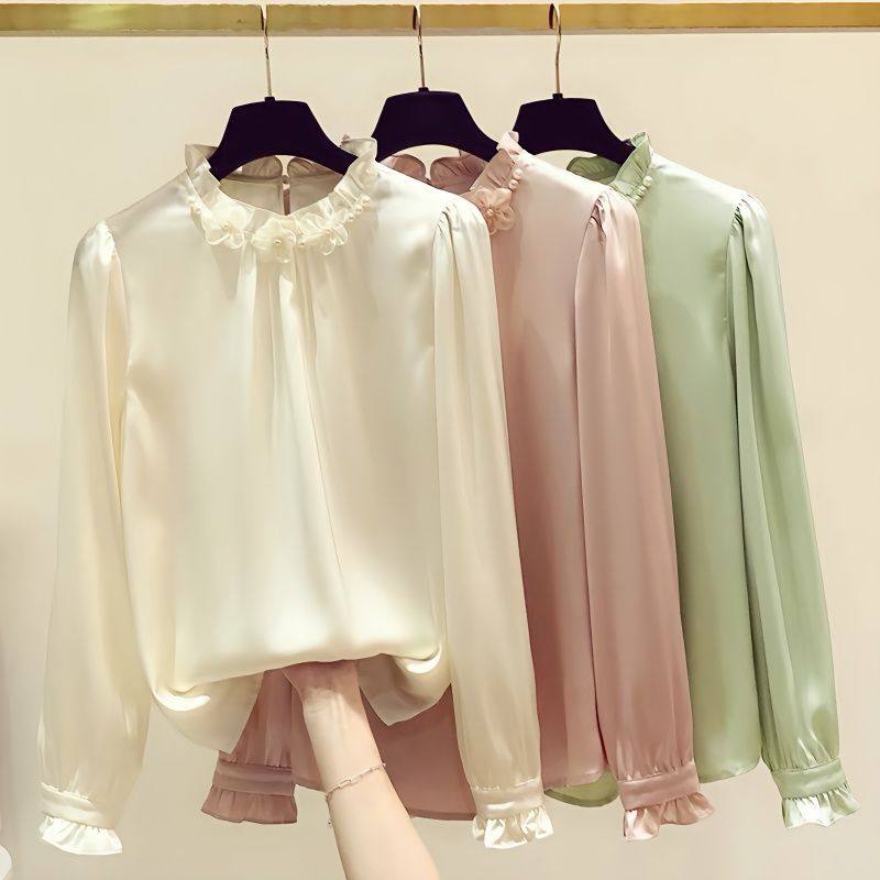 美佰俪别致漂亮雪纺衫女长袖2025秋季新款荷叶边圆领钉珠长袖上衣