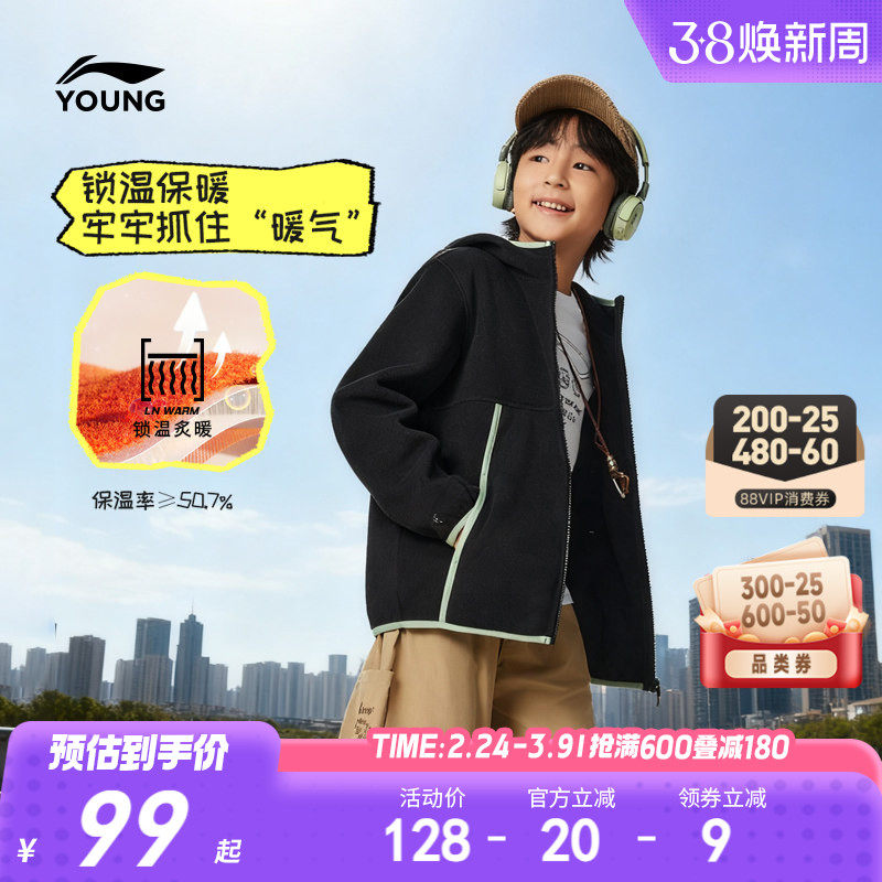 李宁儿童摇粒绒外套加绒男童装男孩新款冬季女童中大童青少年冬装