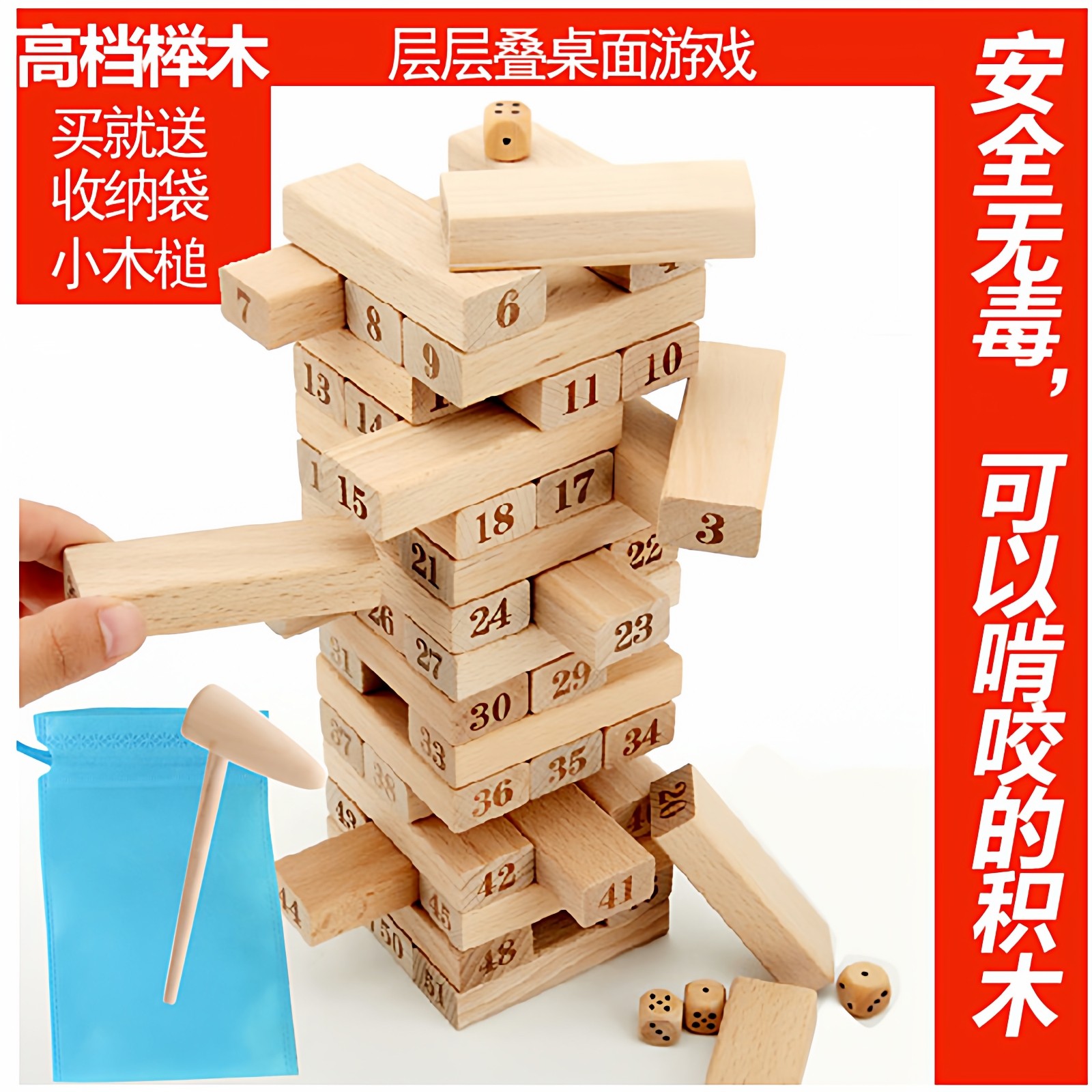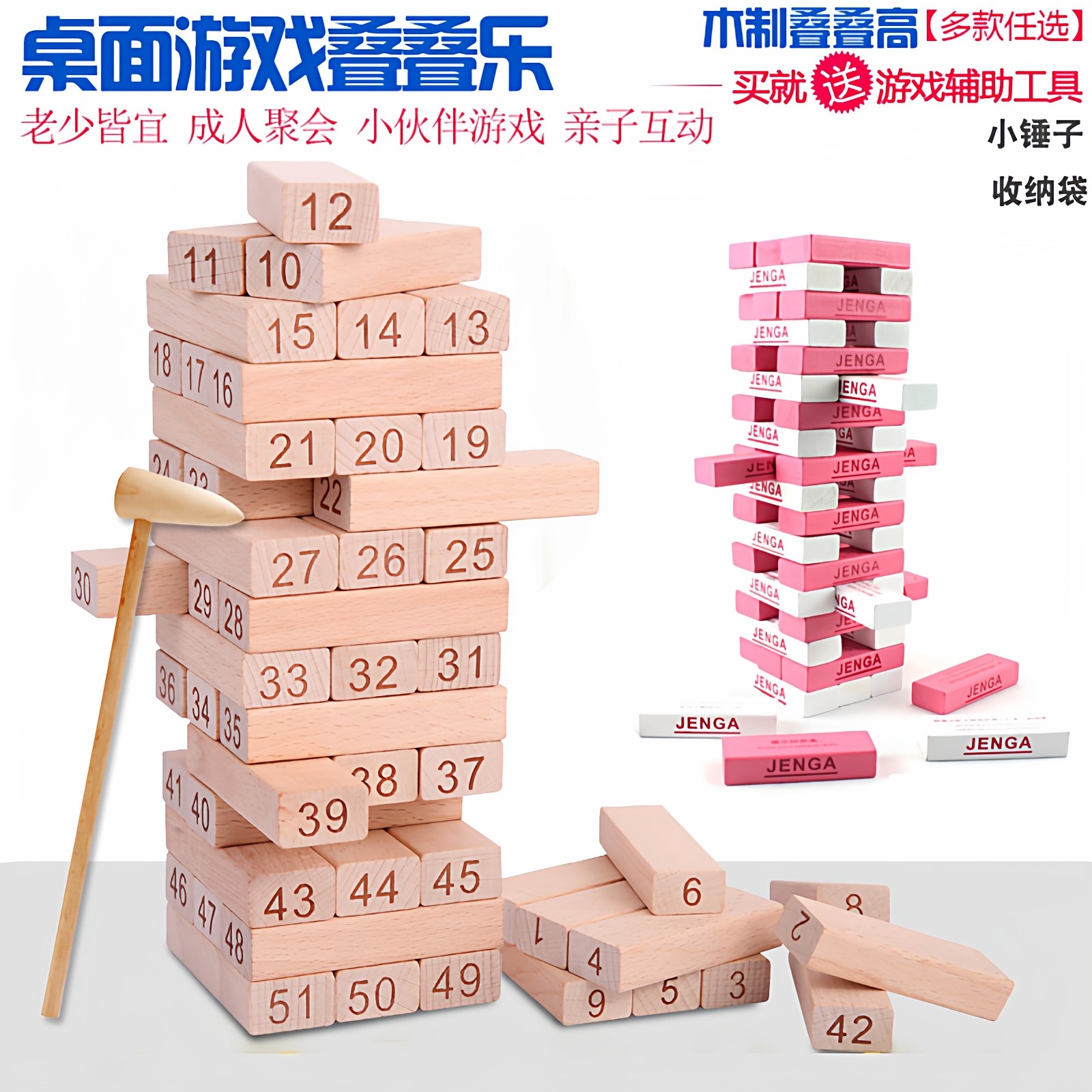 游戏叠叠高彩色48抽积木大号54数字叠叠乐桌游聚会玩具送锤收纳袋