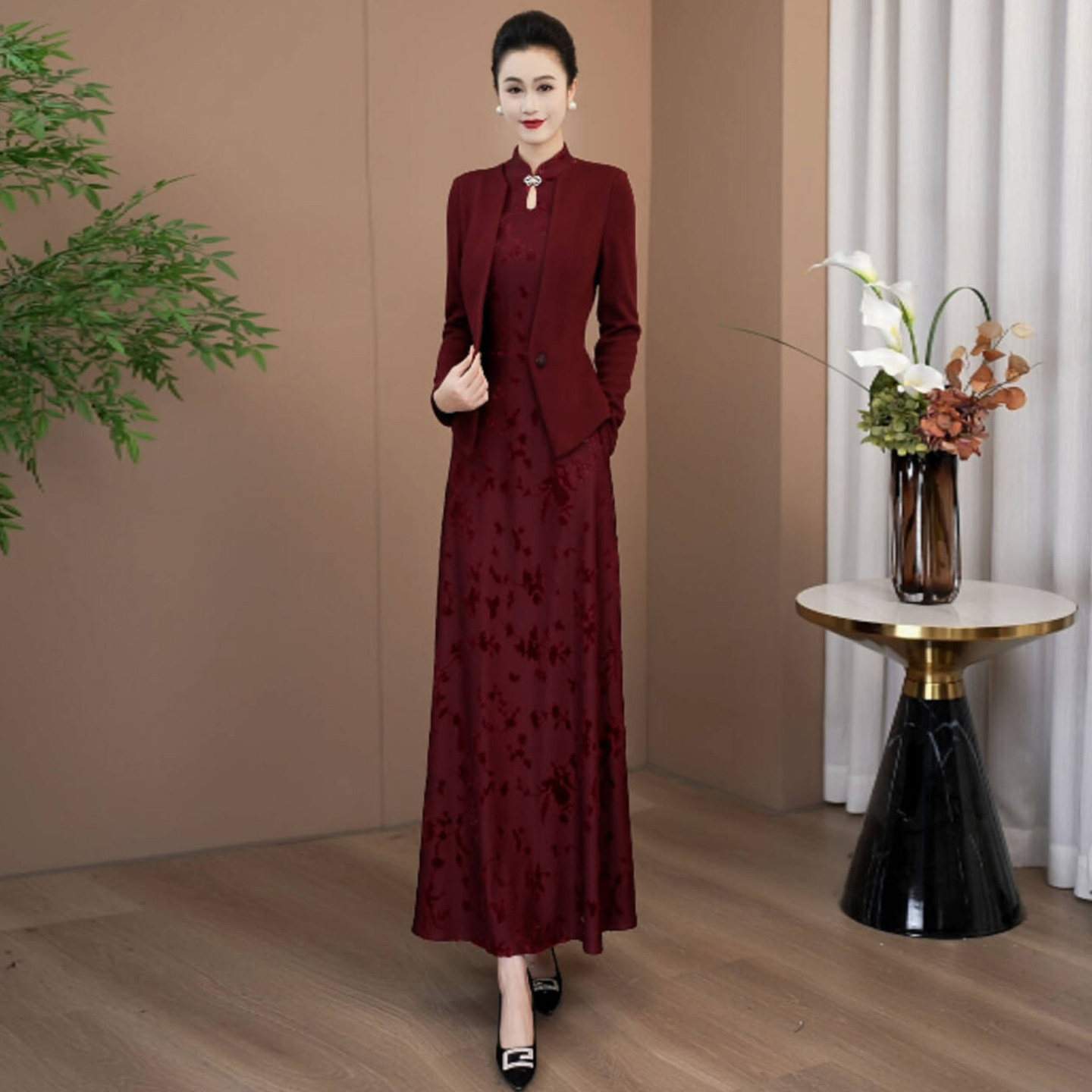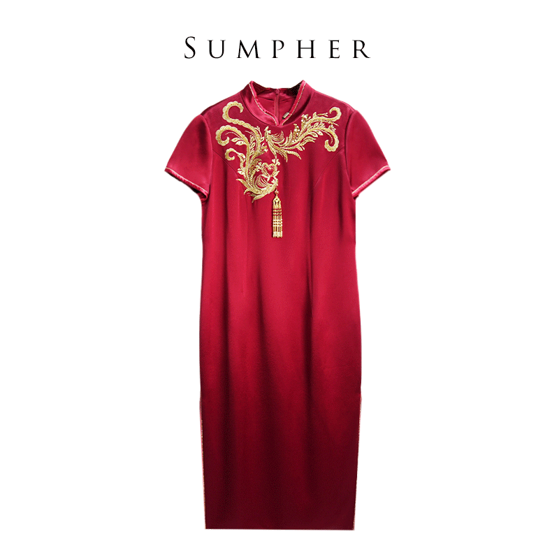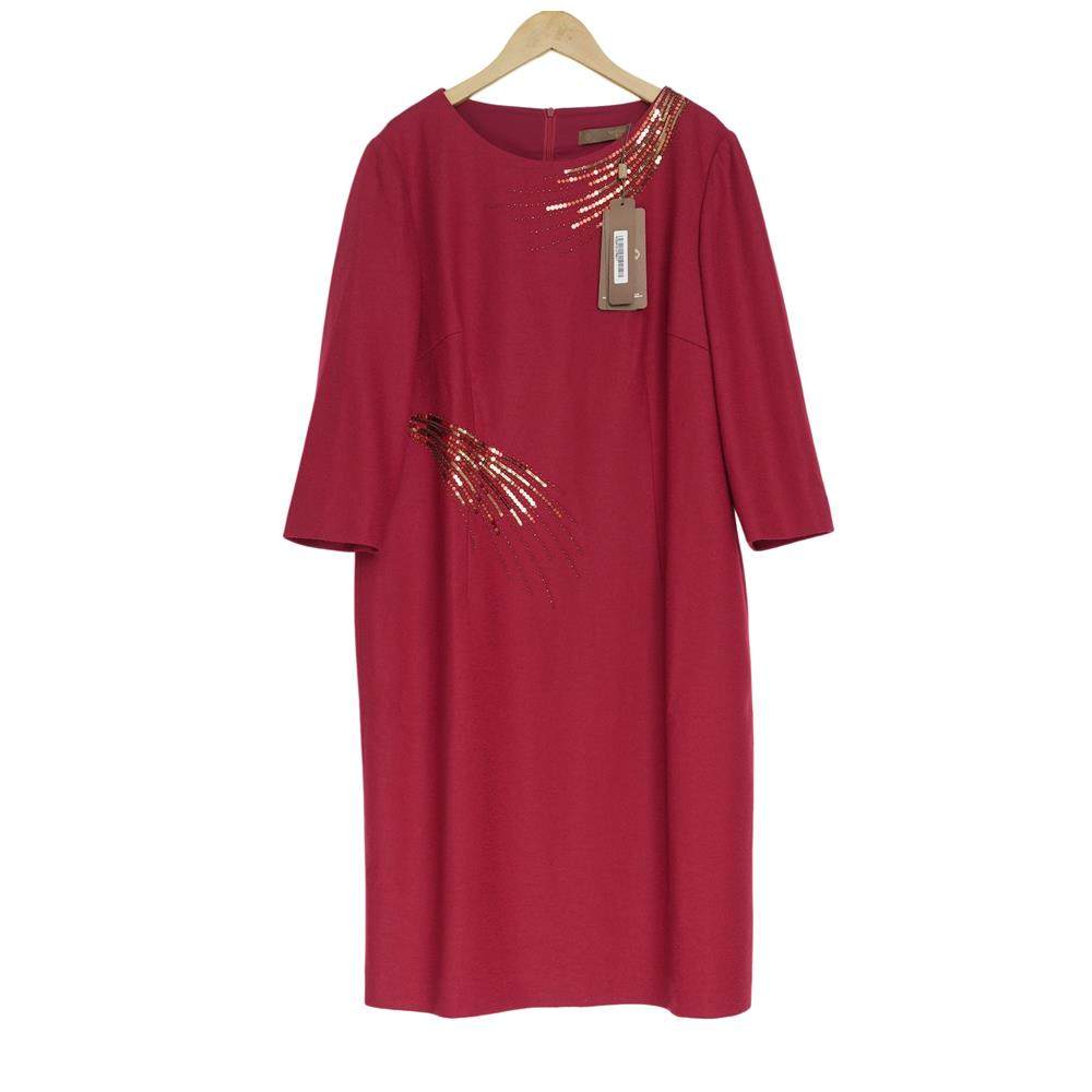 六礼宴会上档次女装高端轻奢喜婆婆品牌礼服酒红色连衣裙-17901