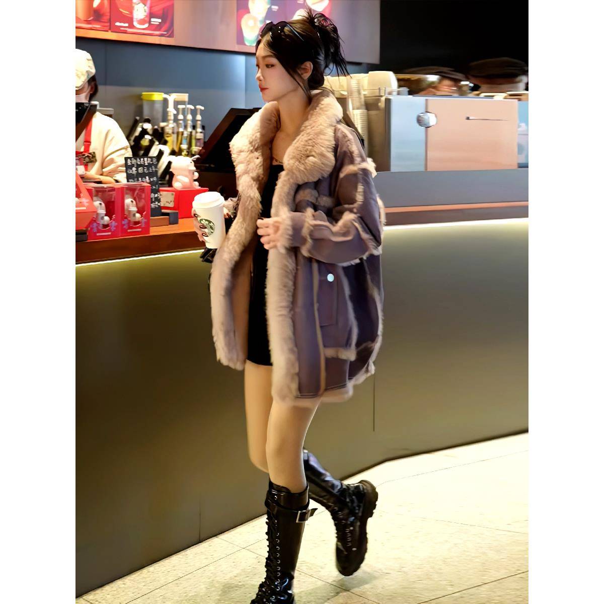 香港韩版皮毛一体外套女士冬季休闲时尚宽松加厚保暖中长款彷大衣