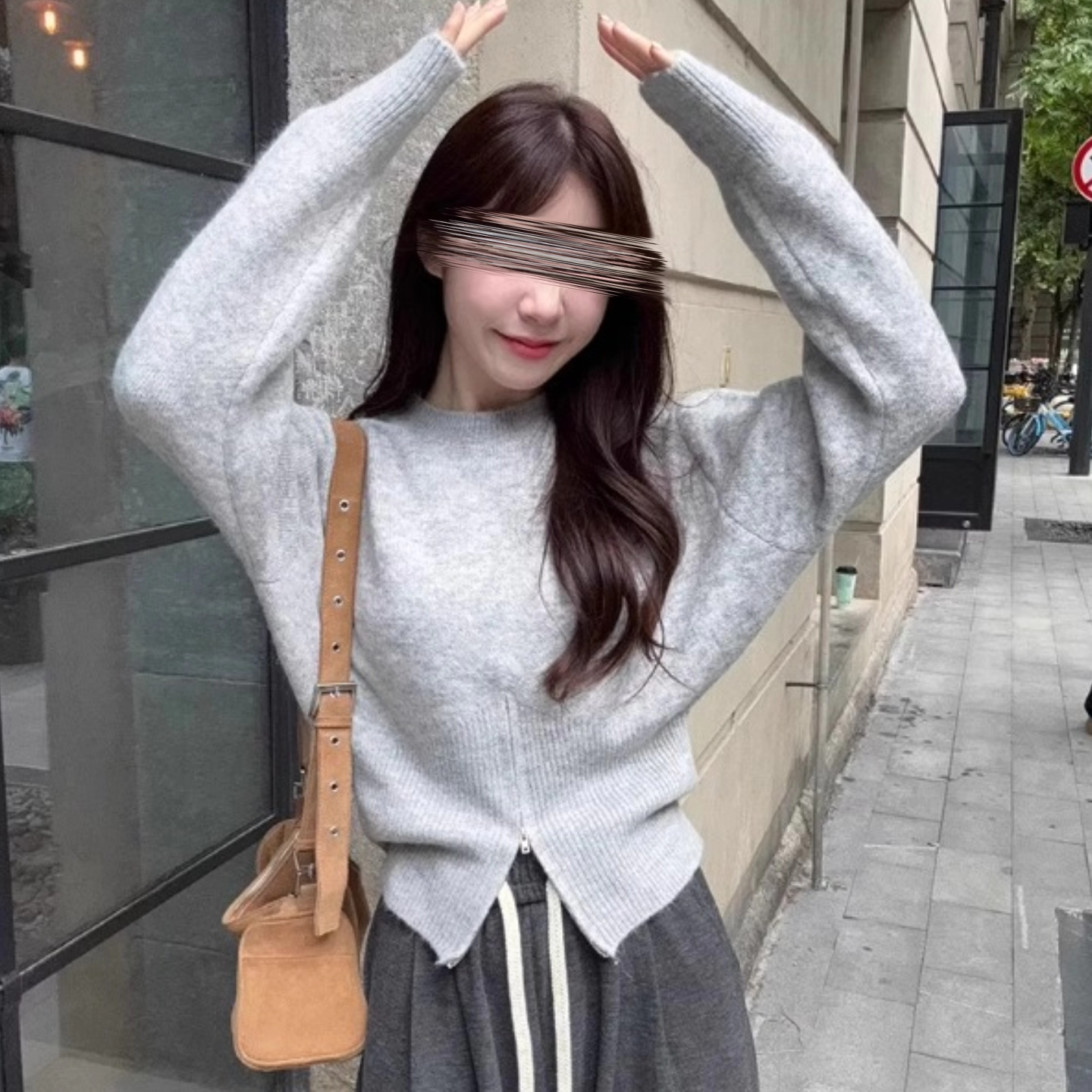 设计感下摆开叉拉链灰色针织衫女秋季韩系穿搭高质量圆领长袖上衣
