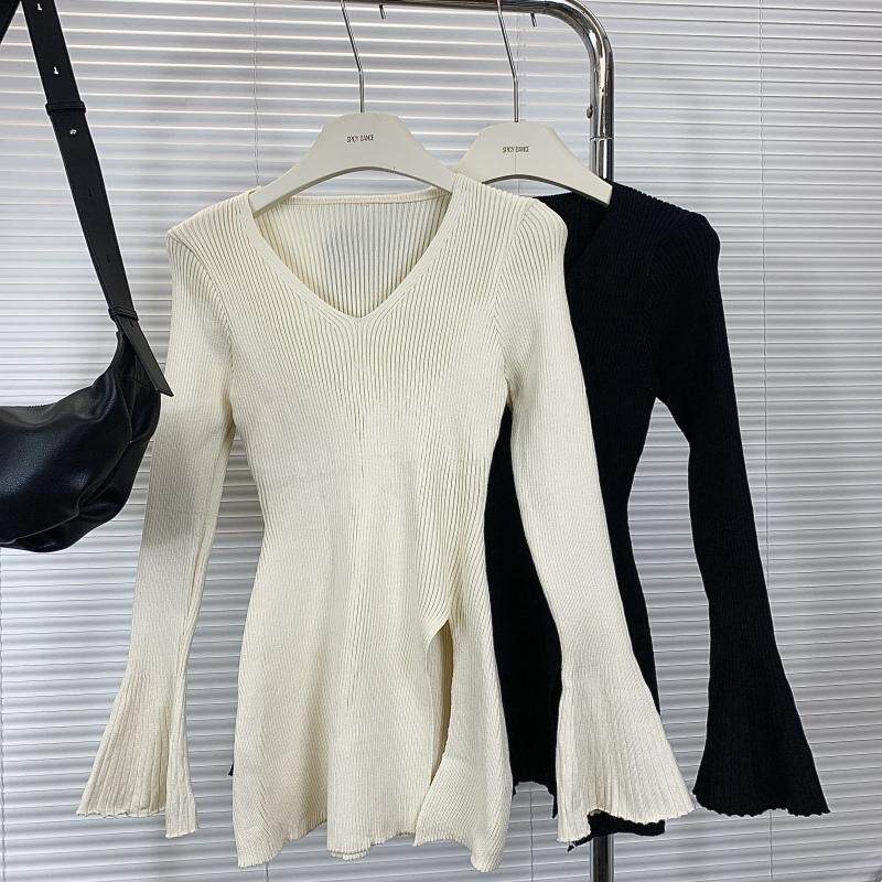 YoungGirlDay 韩漫风性感V领修身显瘦袖口开叉长袖打底针织衫上衣