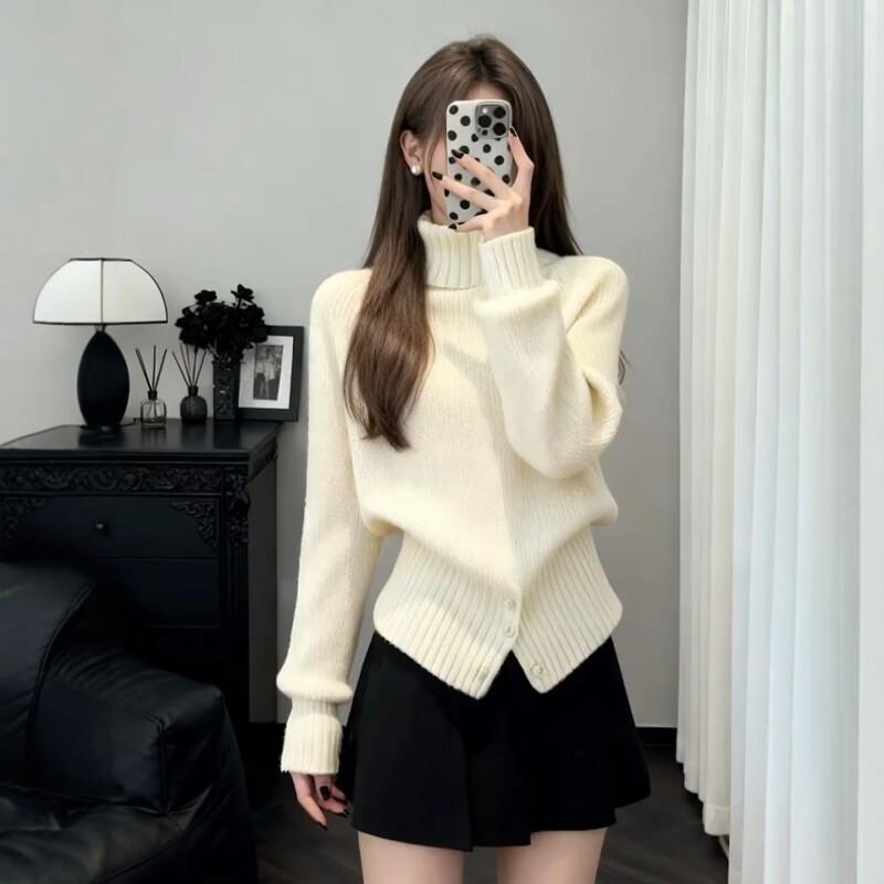韩系温柔慵懒风高领长袖针织衫女秋冬季百搭宽松显瘦软糯开叉毛衣